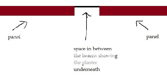 This picture is the best we have, so we showed it to everyone involved in rebuilding the house. One day the contractor called us over to discuss the little finishes to our house, e.g. the size of the trim along our doors and the design of the windowsills. But when we started talking about the living room ceiling, it started getting weird. If we were to look parallel to the paneling, we'd see something like this: