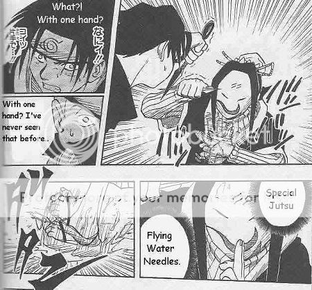 I use this as an example about the problems of moving from one medium to another. I saw this first in the anime before reading it in the manga, and this move took a good ten, fifteen seconds. At the time I thought, "Why the hell is Zabuza continuing his attack when it's obvious that Kakashi's copying it?" In the manga, this looks almost instantaneous. Because the animators had to accommodate all the seals, they created a drawn-out sequence that looks ridiculous in real time. Naruto as a series suffered a lot in the action scenes because of all the internal thoughts, which created awkward pauses. Compare that to something like Cowboy Bebop that had smooth fights without having to stop everything for a character to contemplate what to do next. It works better on page than in animation.