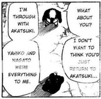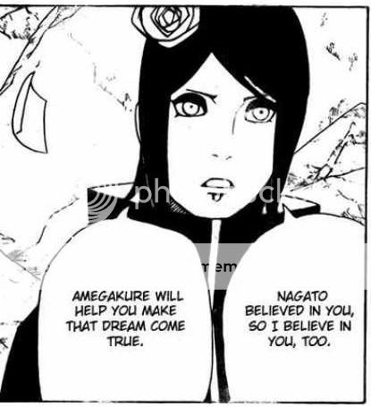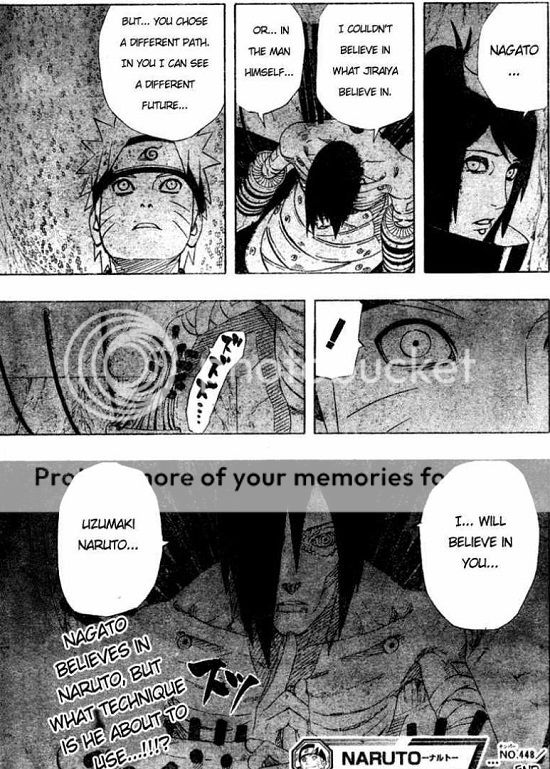 I dunno, I felt like Nagato yielded to Naruto's point of view too quickly. Admittedly there are times when people have a life-changing experience, but considering he's devoted half of his life to this path, having some sixteen-year-old stand in front of you and said with a determined look, "Trust in me, I'll stop the cycle of hatred," doesn't seem that convincing.