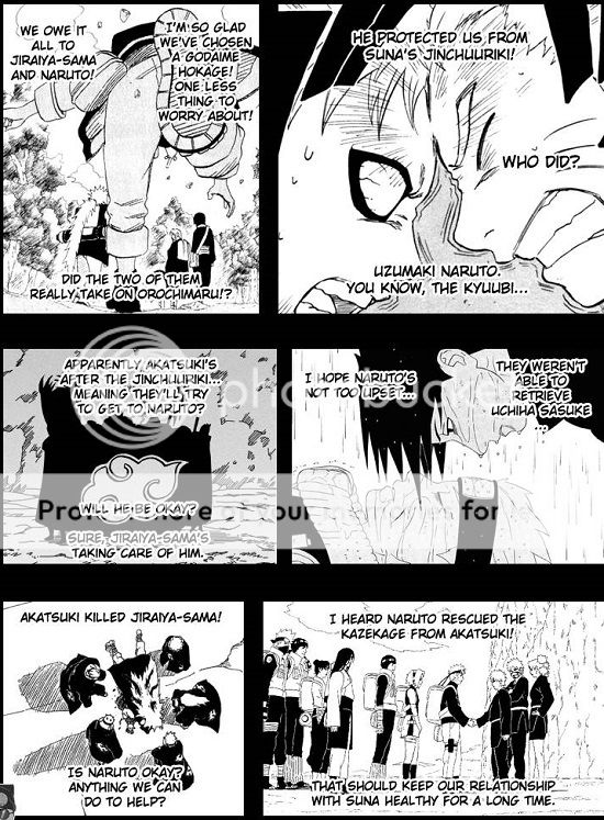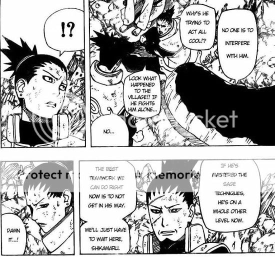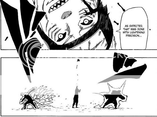 This is the moment I think the essence of Naruto died for me. Until this point, Naruto was filled with interesting characters, some stronger than others, but an underdog was able to beat them either through sheer force of will. Even so, he was just one person and the others were able to use their unique skills to help him out on this adventure, stressing the effort of teamwork. This is the moment when they said, "Naruto's just way to fucking powerful now. Even helping him would be a hindrance." Although that's not to say they weren't integral for the rest of the story, the balance had changed.