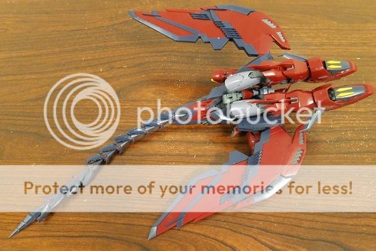 The transformation is surprisingly painless. You detach the whip from the arm, flip the legs over the head, and reattach the whip to the butt. I don't know how that flows in the actual anime and now that I think about I don't believe I ever saw the Epyon transform. Also now that I look at this, I realize the cockpit is facing downward in plane mode. Perhaps it flips internally so he's not hanging from his seat.