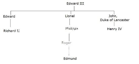 To recap, Richard II sucks, Henry IV kills him, says Edmund doesn't count because Lionel only had a daughter, Henry IV takes kingship because if you ignore Lionel he's next in line. His family is known as the House of Lancaster because he's the duke of Lancaster. He has a son who becomes Henry V, and Henry V has a son who becomes Henry VI. Here's another chart to keep you on point: