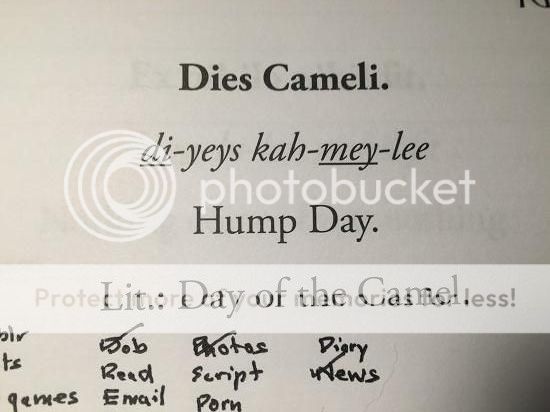 Remember, I'm looking at the Latin, which just says, "Day of the Camel." My eyes then go down a bit and read what they're aiming for. In my confused state I didn't connect "hump day" with "Wednesday." Instead there was a horrible, terrible moment of me picturing either people humping camels or vice versa, and me trying to remember if this was an integral part of ancient Rome.