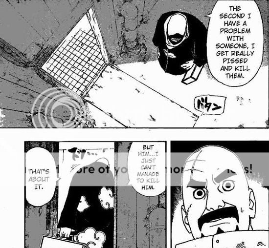 I remember when this chapter came out, everyone was pissed. I mean, it was pretty clear that Akatsuki was going for some sort of world-dominating scheme, but this just seemed like such a ... not epic way to do it. Remember back in part 1 when Jiraiya first mentioned them and we were all shitting our pants thinking that there's a group of people that even Orochimaru is wary of? Actually meeting them just ruined everything, but not so much as in this moment.