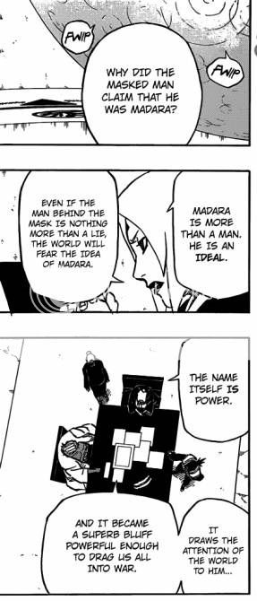 An essay I read about good writing techniques said it's better to show and not tell, e.g. have a character demonstrate his intelligence like Shikamaru instead of just having people say that he's intelligent. I feel like Kishimoto here is trying the showing thing; we literally spent about maybe half the series without talking about Madara. Oh yes, he showed up at the Valley of the End so there are hints he's supposed to be in shinobi culture, but if he's the boogey man in that haunts children at the night, you'd think people would mention him on occasion before the war started.