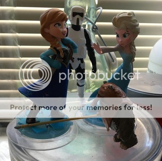 Harlan's woman: Do you see this? Your brother keeps this display in the kitchen. And he keeps on rearranging them too. Yesterday the Ewok was between the Frozen people. It's not like he just left them there and forgot about it. He's looking at them every day. I don't understand why he put the Frozen princesses with the Star Wars characters. He says it's because they're friends. I need space in the kitchen.